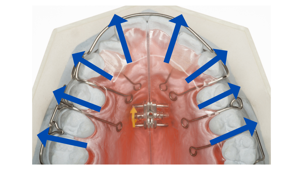 スペースを確保する際、拡大床と呼ばれる装置で歯列(あごのアーチ)を外側に拡大することがあります。